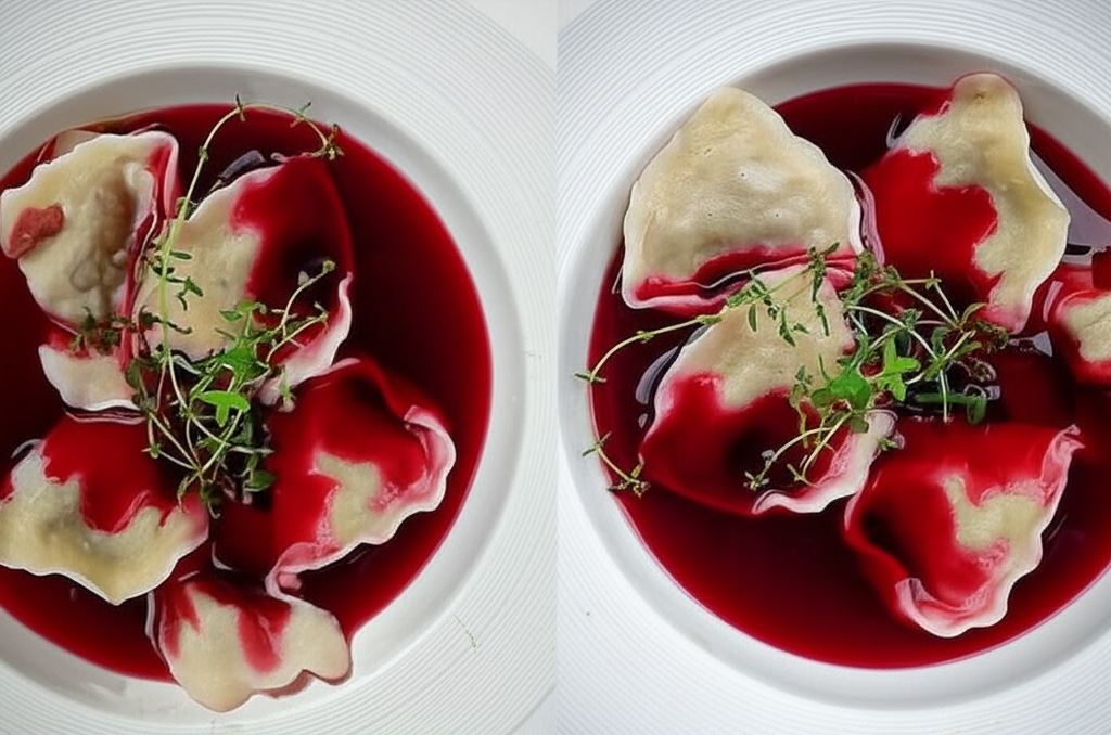 Barszcz czerwony na zakwasie z buraczków i wywarze grzybowym, podany z pierożkami pielmieni 6szt. z mięsem wołowym i kleksem śmietany