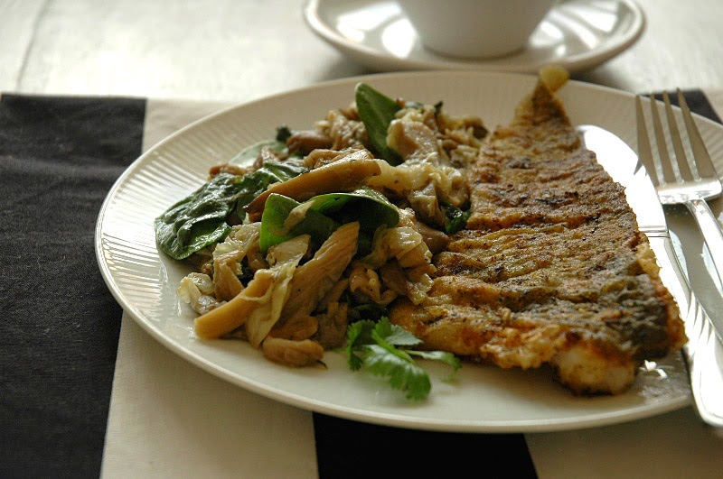 Filet z dorsza smażony soute z boczniakami duszonymi w sosie śmietanowym z nutą czosnku, podany z ziemniakami i zestawem surówek