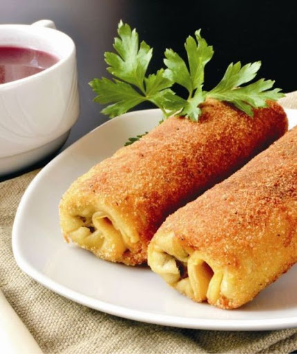Krokiety z kiszoną kapustą w rumianej panierce, podane z barszczem czerwonym solo 250 ml