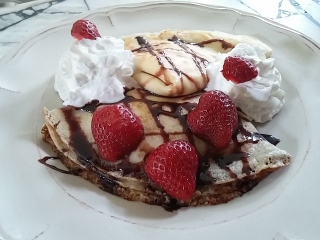 Naleśniki z serkiem waniliowym podane z owocami sezonowymi i bitą śmietaną