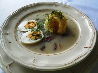 Żurek na wypasie na naturalnym, żytnim zakwasie podany z jajkiem, kiełbasą wiejską, gałką ziemniaków i cebulą